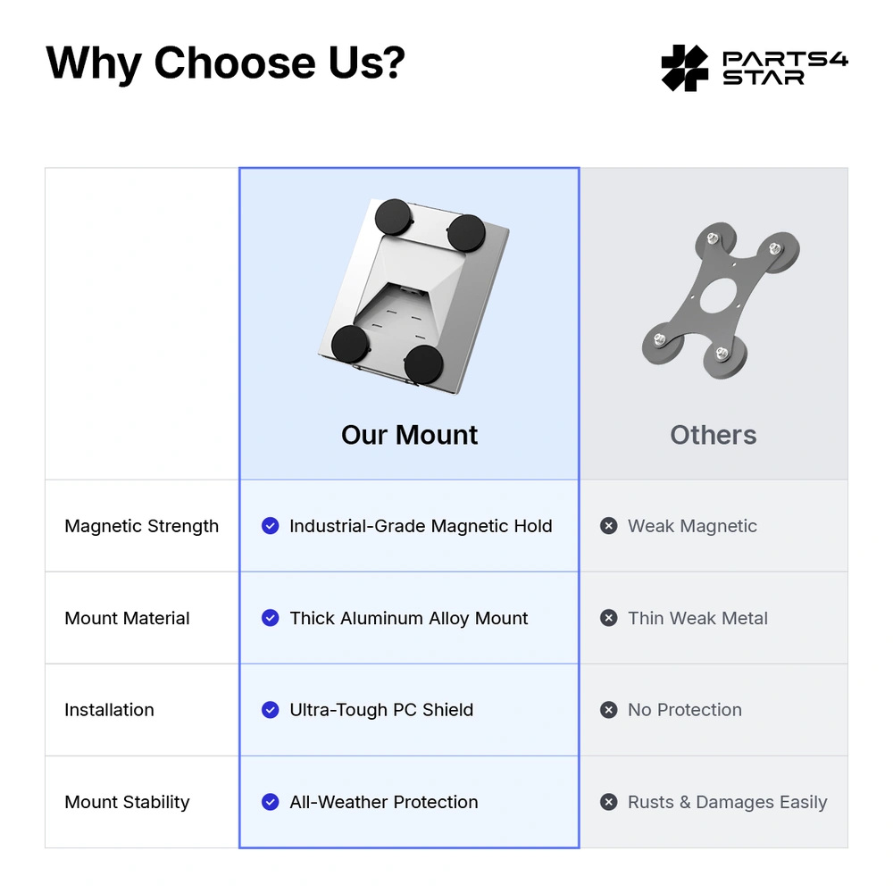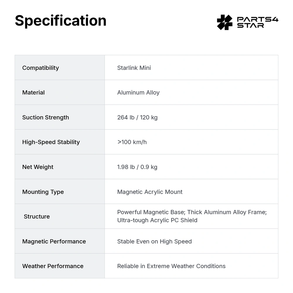 Stay connected anywhere with the Starlink Mini Magnetic Flat Mount Kit, built for strength, stability, and protection. With a powerful 264 lbs magnetic load capacity and a durable PC cover plate, it keeps your Starlink Mini securely mounted on any flat metal surface — from your vehicle roof to outdoor setups — without compromising signal quality or safety.