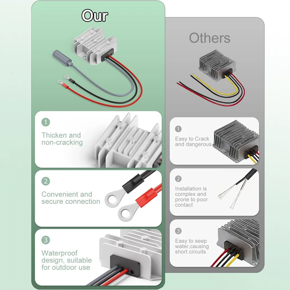- Wide Input Compatibility: Accepts 9–28V DC from car batteries, solar panels, and other power sources.