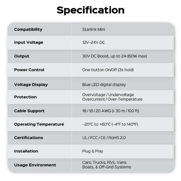 - Stable 30V Step-Up Output: Advanced step-up conversion module delivers a stable 30V output, minimizing voltage fluctuations and helping prevent device restarts for reliable Starlink Mini operation.