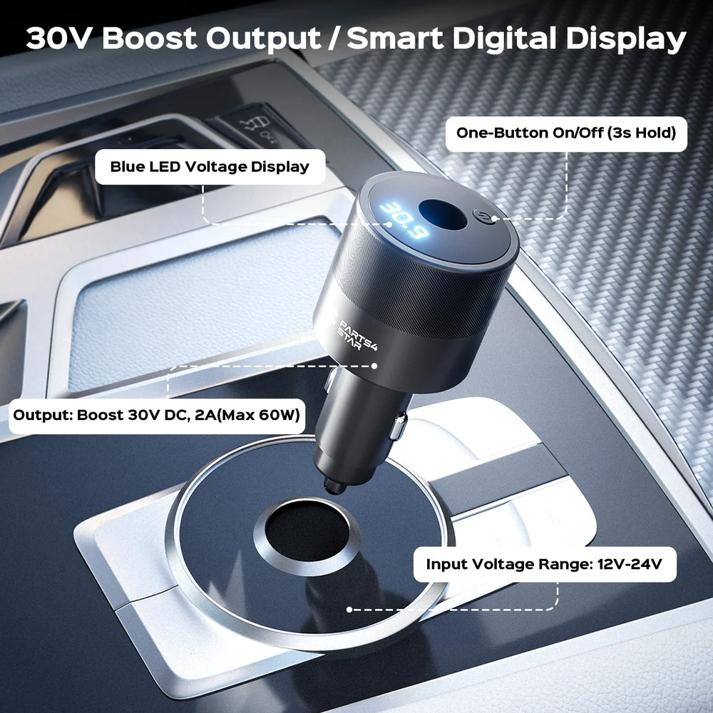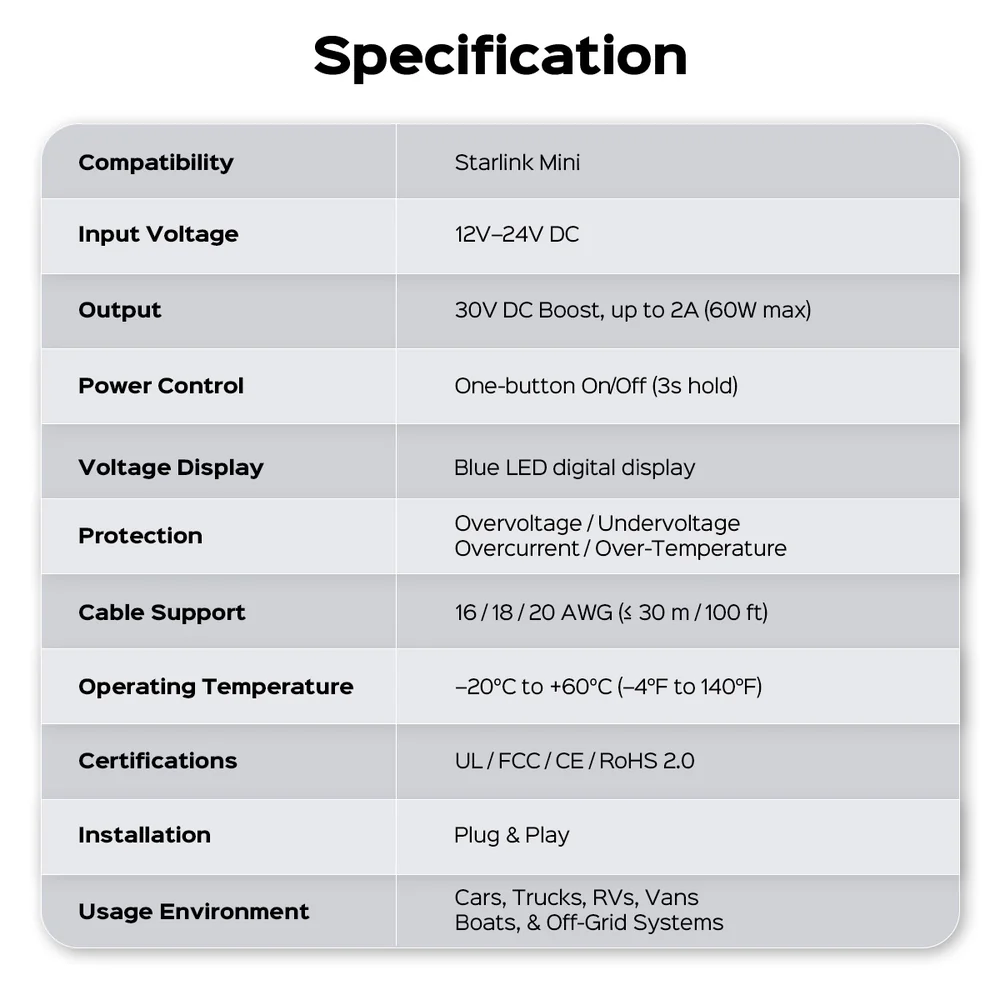 The Starlink Mini Car Adapter converts 12V/24V vehicle power to a stable 30V output for reliable Starlink Mini operation. It features a digital voltage display with built-in low-voltage protection that cuts off output to prevent battery over-discharge. A built-in on/off switch allows safe power control and reduces the need for frequent plugging and unplugging. Built in a compact, integrated aluminum alloy housing, it fits standard cigarette lighter sockets and supports cars, trucks, RVs, boats, and portable power sources.